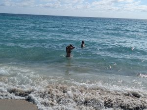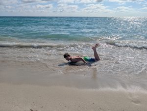 Pak jsme se vydali na Miami South Beach. V noci to ukazovalo 30min lyftem (něco jako bolt), ale v ranních zácpách se nám to protáhlo na celou hodinu. Řidič přejel místo, kde jsme chtěli vystoupit a pak se tam musel vracet, ale nakonec to zvládl a my byli u moře :). Děti hned vběhly do vody, my jsme se šli rozhlídnout kolem (čti prohlídnout si nápojové lístky). V restauraci jsem pak nechala kapsu s penězi i s pasy, takže mohlo být ještě veseleji :-D. Naštěstí jí nikdo nevzal. Po cca dvou hodinách jsme se odpískovali (někteří míň, někteří víc úspěšně) a pěšky došli k Art District, kde děti dostaly úžasnou zmrzlinu v Da Vinci Gelato.