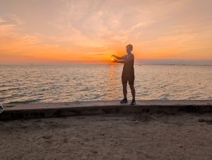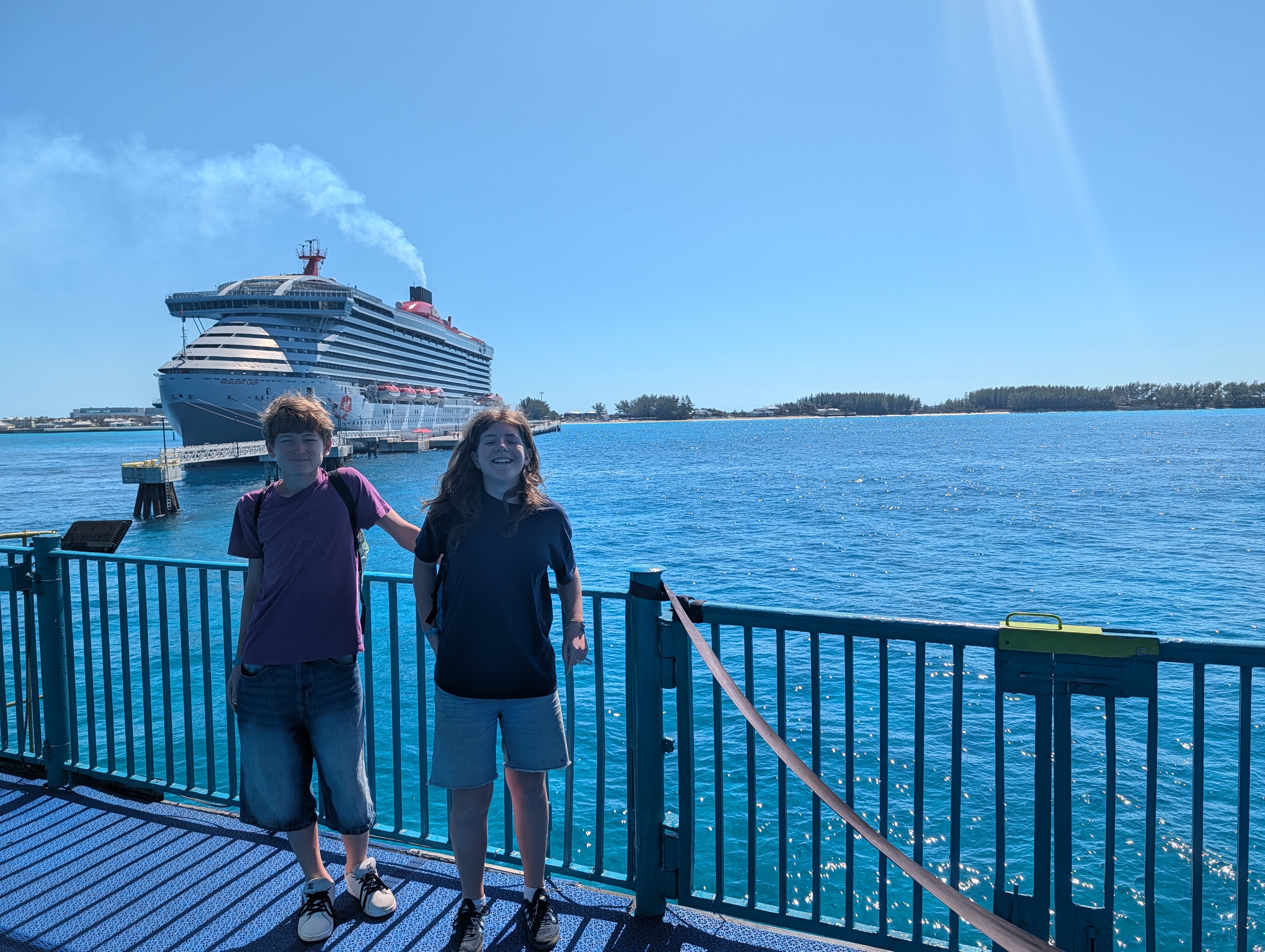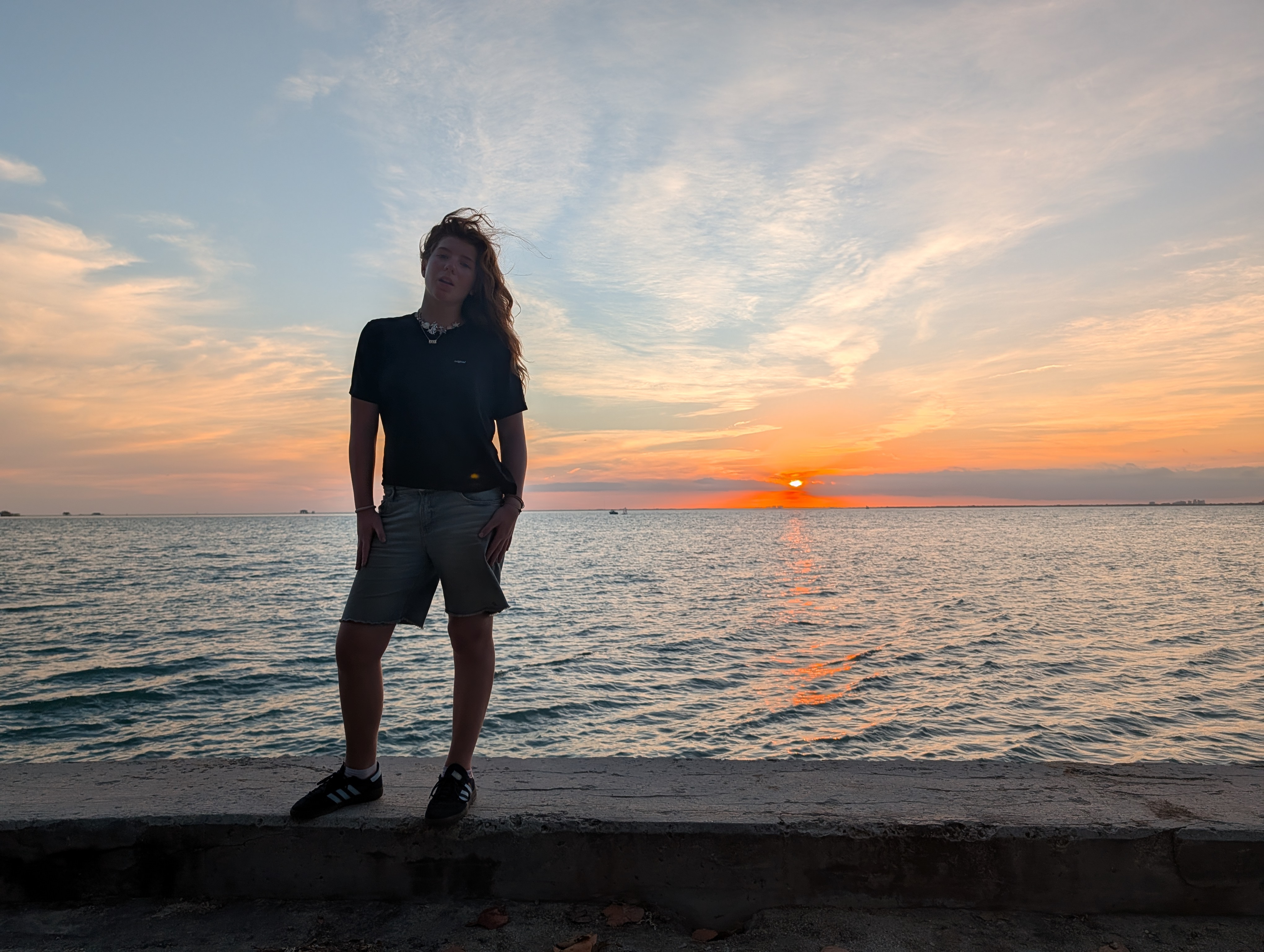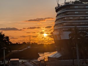Když byl čas odjezdu, abychom stihli zase checkin a kontroly u vstupu na loď, rozloučili jsme se s pláží a vyšli k hlavní silnici. Tam jsme potkali naší babičku z rána, takže jsme se svezli taxíkem zase s ní a trošku jsme si pokecali. Zrovna v té době se hrál hokej, semifinále na ZOH – USA:SVK a Američani vedli 1:0. Ale přesto byla nálada v autě dobrá, až veselá a ne nějak nevraživá. Vystoupili jsme zase tam, kde jezdily shuttle autobusy. Zase jsme chtěli jít těch pár minut pěsky, ale místní kontrola nás nepustila na most. Nejdřív říkal, že check-in na loď ještě nezačal, takže máme počkat (takže nás to stálo další dva drinky u té pláže v přístavu, tentokrát to byly koktejly servírované v kokosu), ale ani pak nám nedovolil jít pěšky. Museli jsme se potupně vrátit na náměstí a počkat na shuttle bus. Tím jsme projeli ten most a nahnali nás na kontrolu (zda něco nevyvážíme, šlo jim právě o ty mušle). I přes všechno tohle jsme byli na lodi včas, abychom zopakovali nejen ranní dvakrát placenou objednávku (nebyl signál, takže se nestrhla částka z karty, zaplatili jsme to hotově, ale pak později se strhla i ta původní platba), zahráli si karty a po nádherném západu slunce dorazili včas do Miami. Péťa se vlivem koktejlů hezky rozpovídal anglicky, takže jsem nemusela opravdu nic řešit.