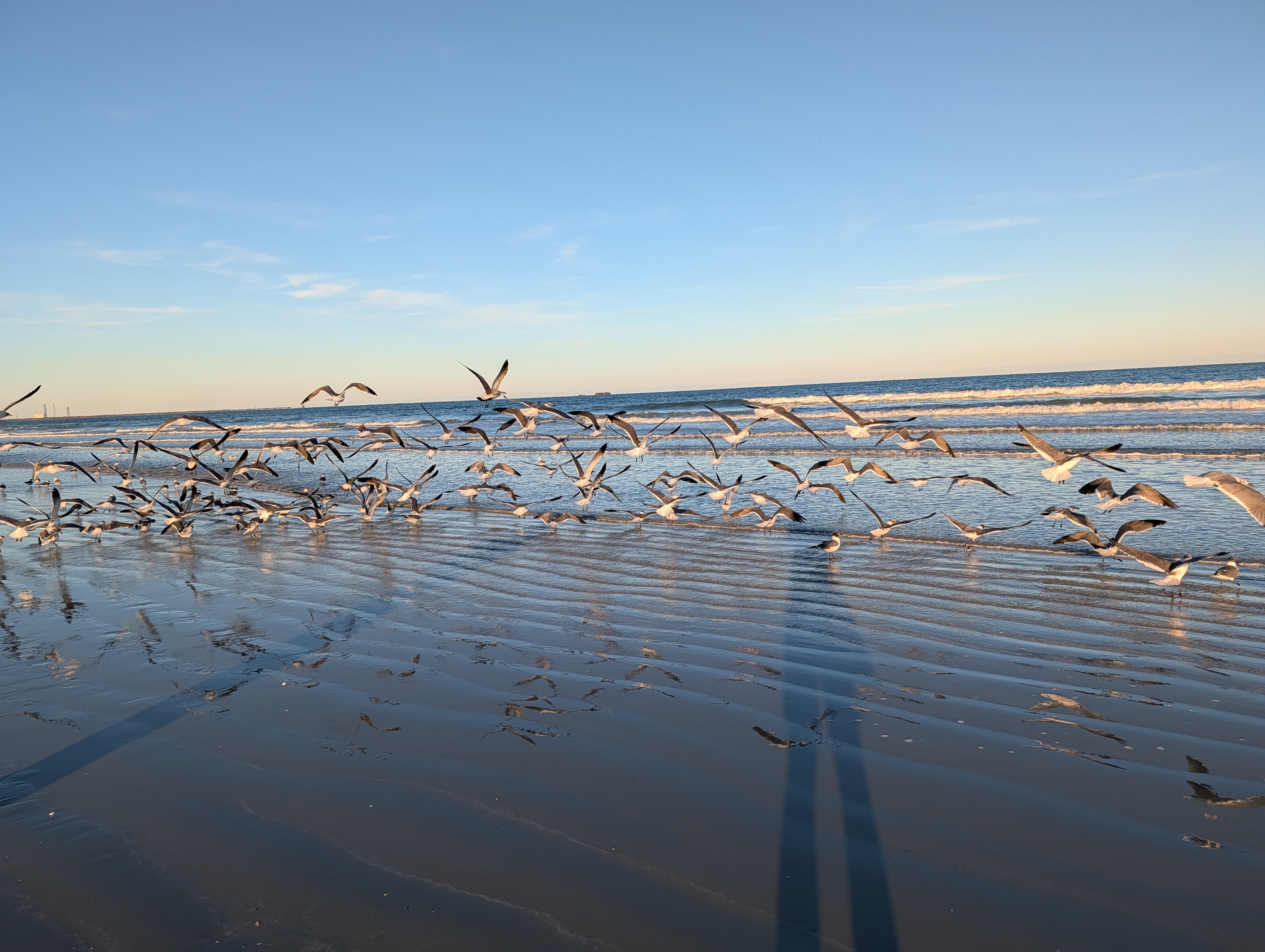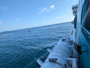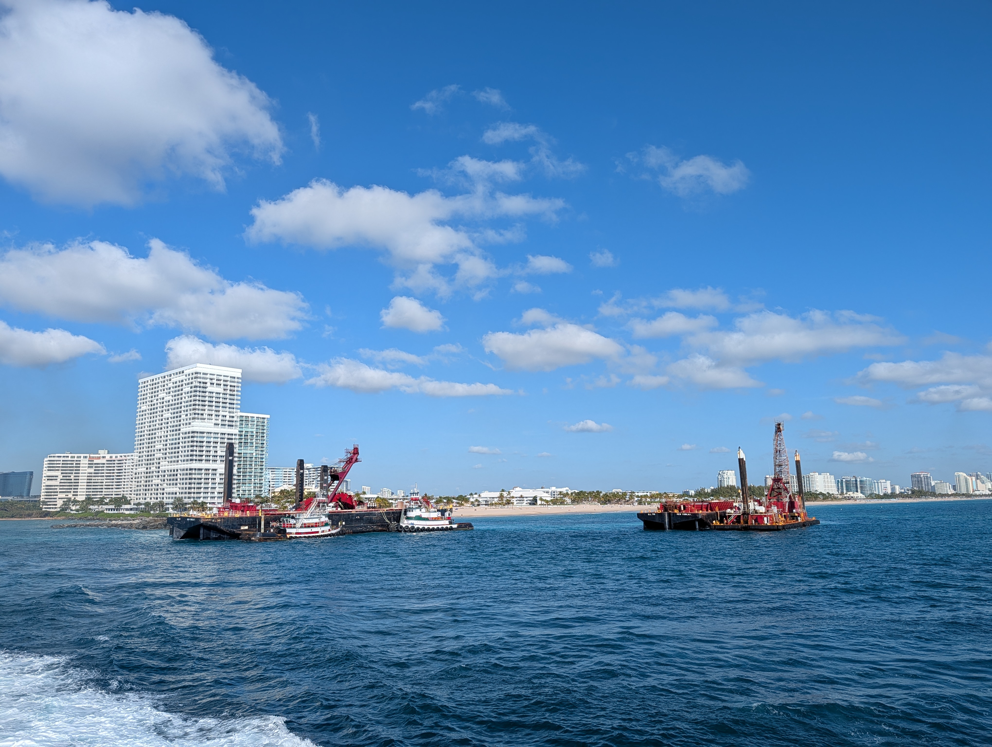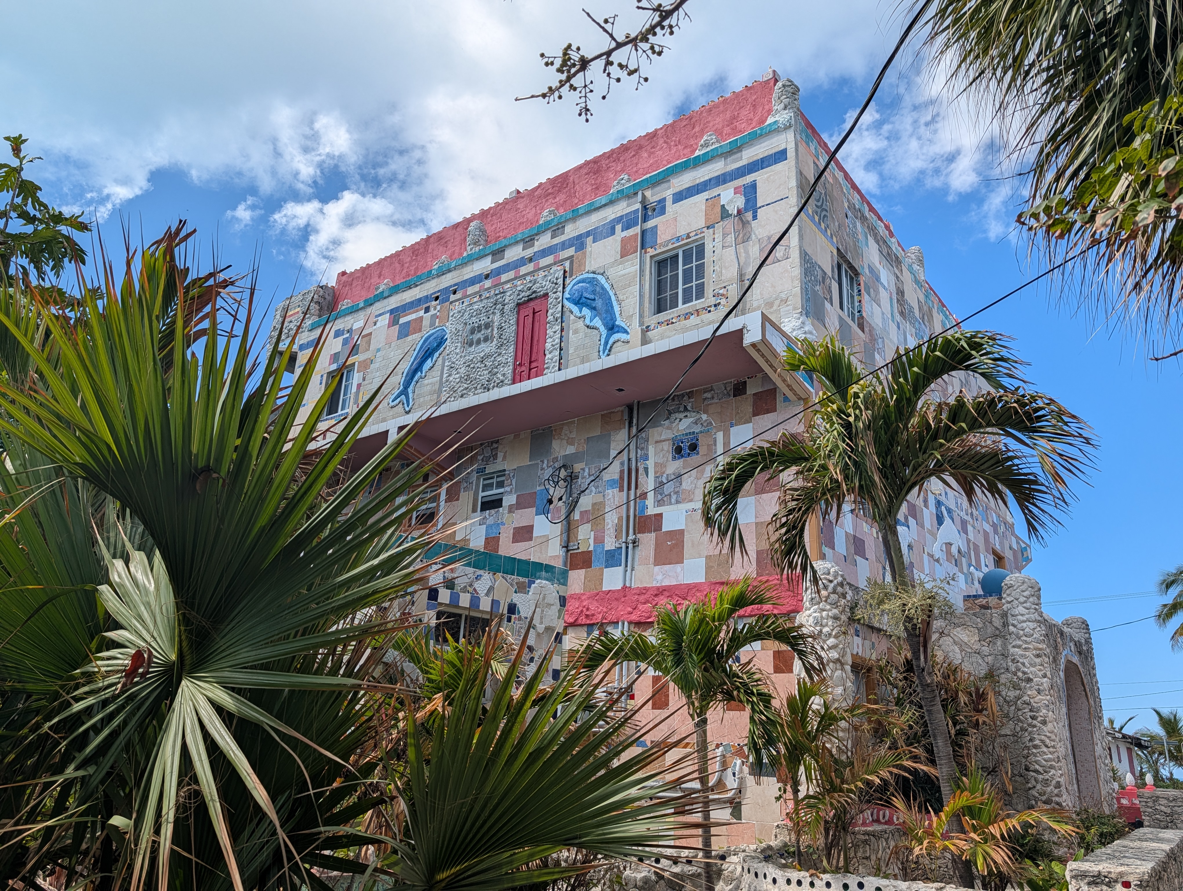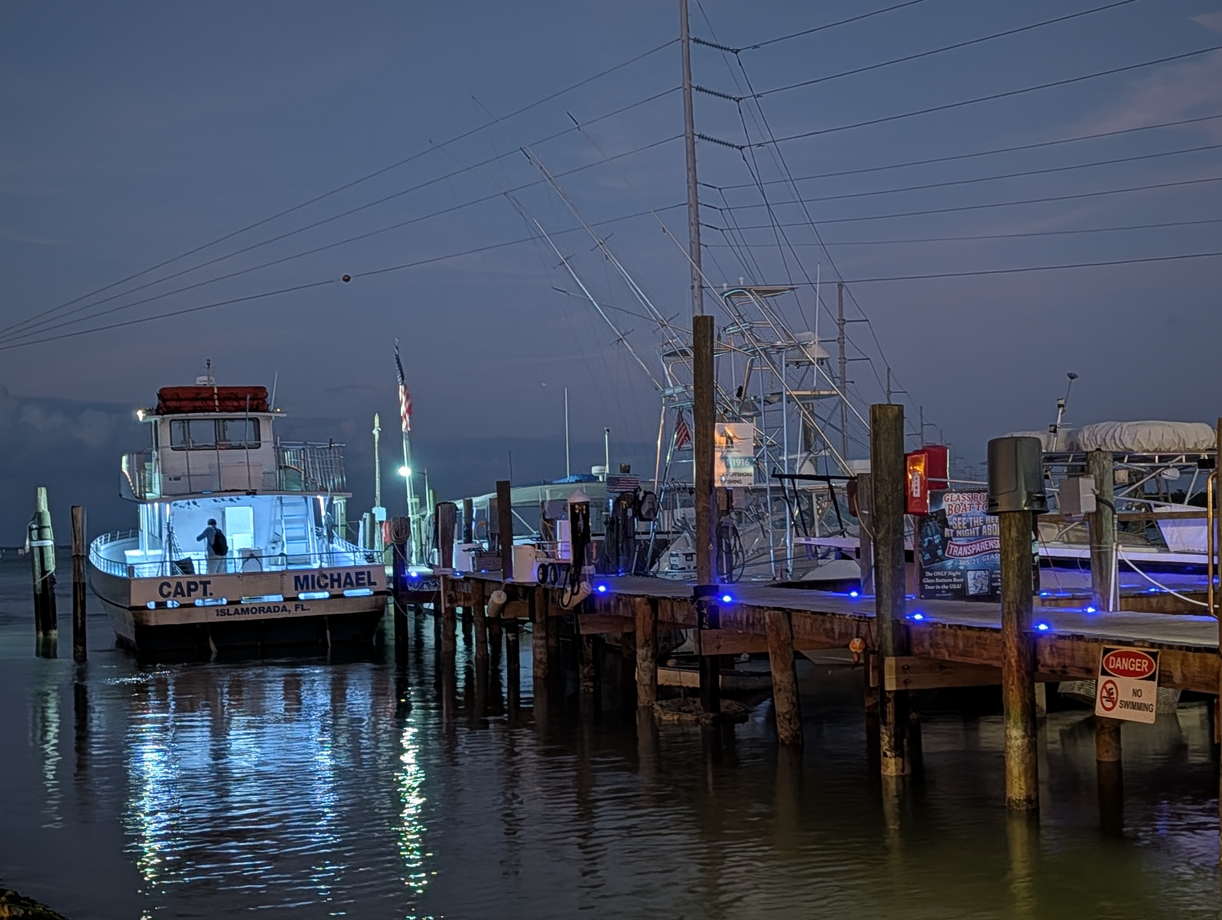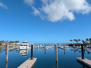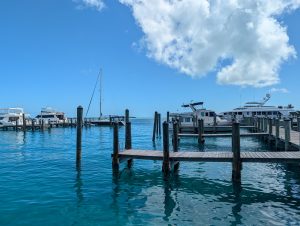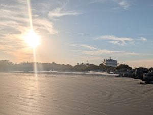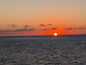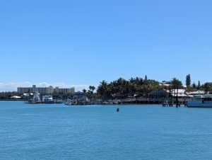 Vstávání v 5 nebylo nic moc, ale nějak se nám povedlo být za 15 minut venku a krátce po šesté jsme už vystupovali na Port Everglades. Po všech kontrolách (jízdenky, pasy, ESTA) jsme si sedli do čekací haly a u východu slunce se nasnídali. Všude jinde u ferries byly za kontrolami stejně jako na letišti alespoň nějaké kavárny nebo bistra, tady byl jen stojan s reklamami. V 7 měli zavírat check-in a přestat pouštět, ale ještě v po osmé tam přicházeli lidi. Asi jsme mohli klidně vstát o něco později :-). Po vpuštění na loď jsme si našli supr místa i se stolkem, takže cesta byla pohodlná, vlastně ani ne tak dlouhá (cca 2 hod). Po 11té jsme parkovali na Bimini, ale ještě půl hodiny nás nechtěli pustit z lodě. Naštěstí pak vystupovali prvně ti, co přijeli jen na den, na otočku (měli jsme náramky různých barev), takže jsme byli v první vlně.