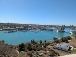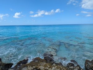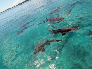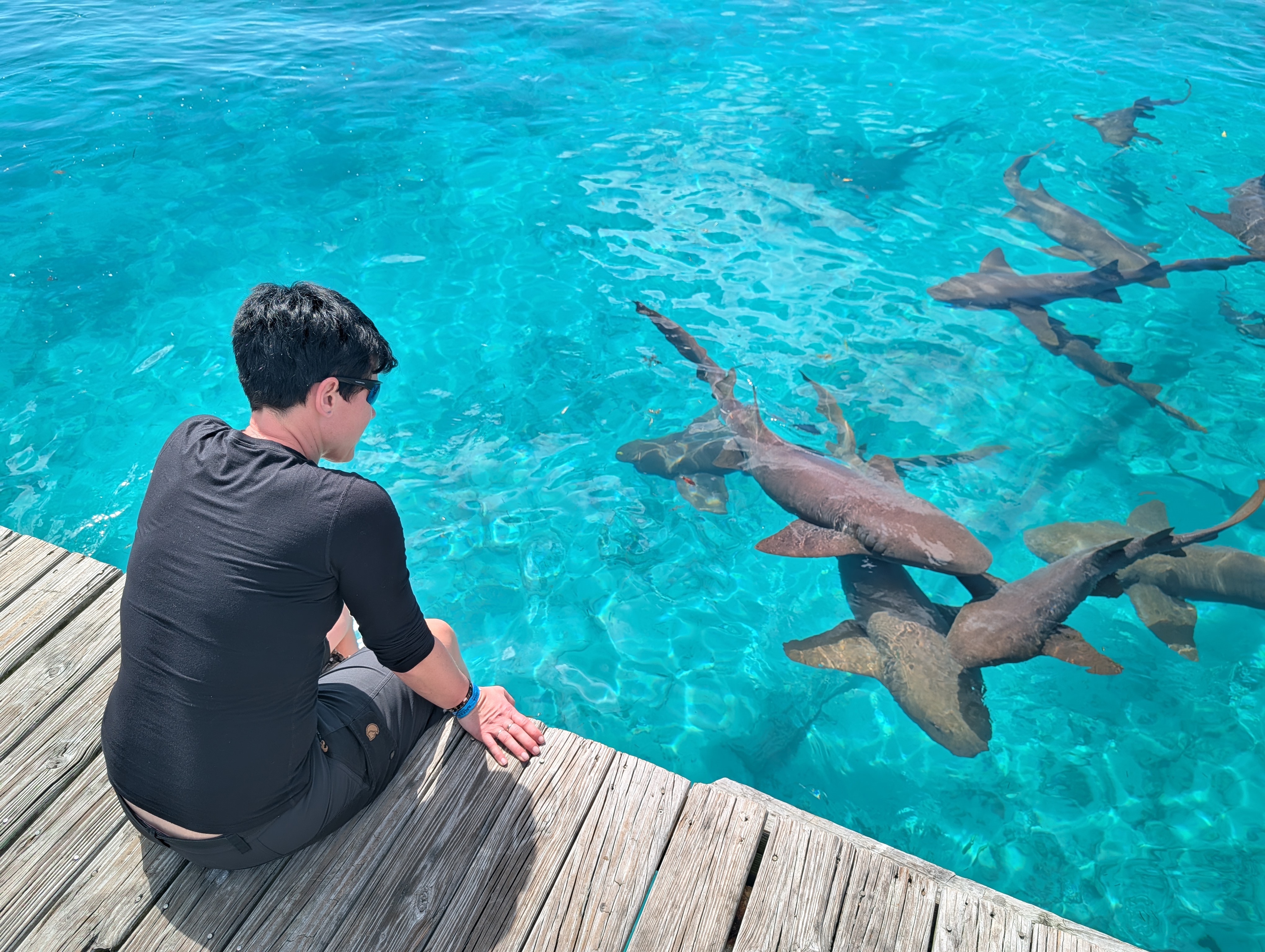 Hned po výstupu tam čekaly shuttle vláčky, které vozily lidi z lodě na nějaké náměstí jen přes most na pevninu. Nám se nechtělo čekat, tak jsme šli pěšky, bylo to asi 5 minut.. Na tom náměstí bylo milion místních, kteří nám nutili golf car. Verča už chtěla do moře, takže by nejradši zůstala na té první pláži hned u přístaviště, my ostatní jsme doufali, že se nám podaří zamluvit šnorchlování k SS vraku Saponě, nebo vlastně kdekoliv, protože voda byla ta, čistá, že by bylo úžasně vidět i pod vodou. Všude měli ale plno a odkázali nás ještě na jednu společnost, která byla u hlavní pláže Radio Beach. Tam jsme se museli dostat taxíkem. Jeli jsme ještě spolu se dvěma dalšími lidmi, s jednou holkou, která se takhle jezdí potápět a s babičkou z New Yorku, která sama dost cestuje. Nejdřív jsme zkusili poslední společnost Big Game, která ještě padla v úvahu, ale ani tam nebylo místo. Tak jsme se rozhodli, že zůstaneme u moře, ať si to děti užijí a my s Péťou se projdeme trošku pěšky po okolí. Ale ještě jsme chvíli zůstali u Big game, protože tam hned u nohou plavali žraloci a mohli jsme na ně koukat v té fakt čisté vodě, to byl supr zážitek.