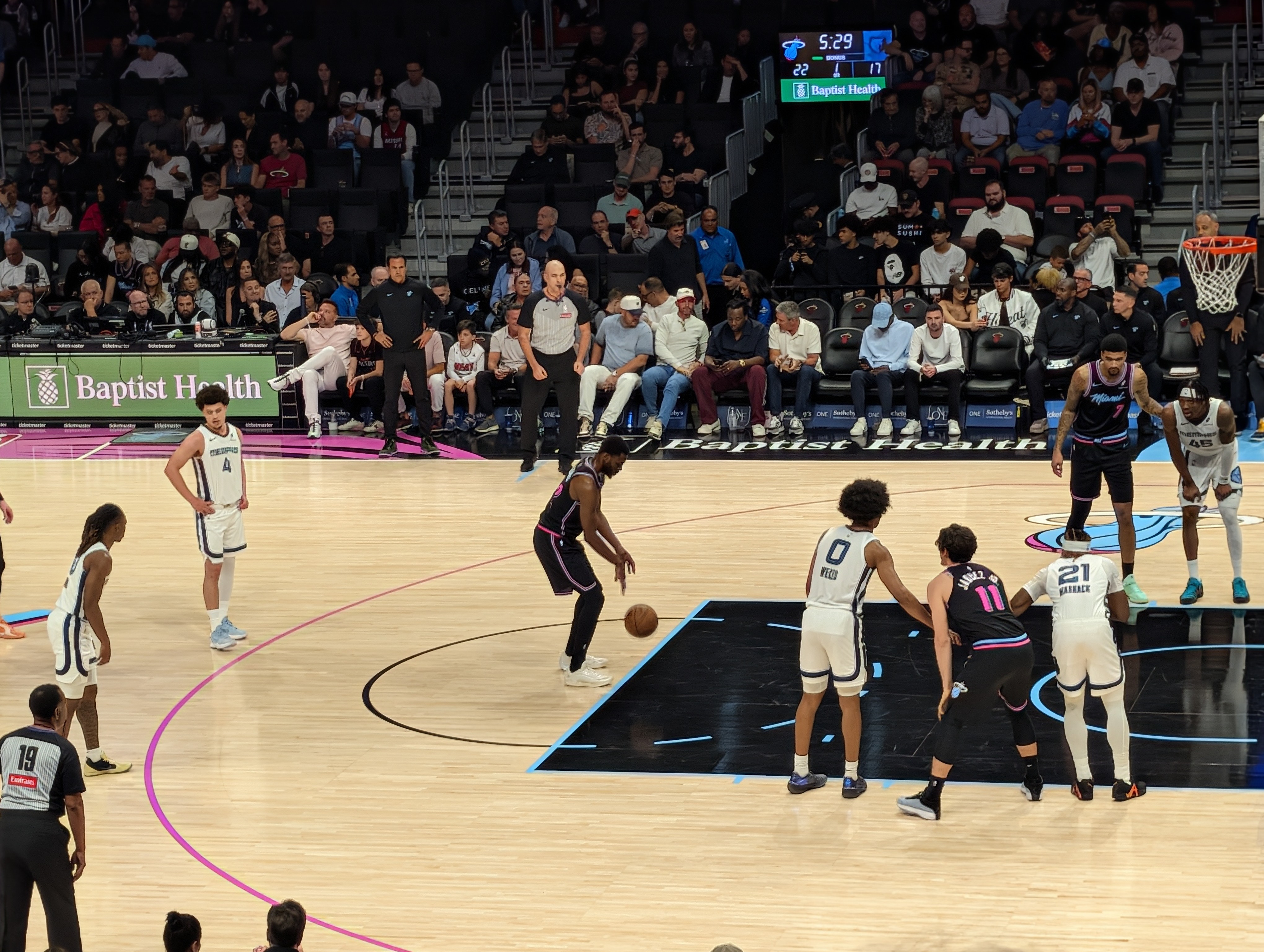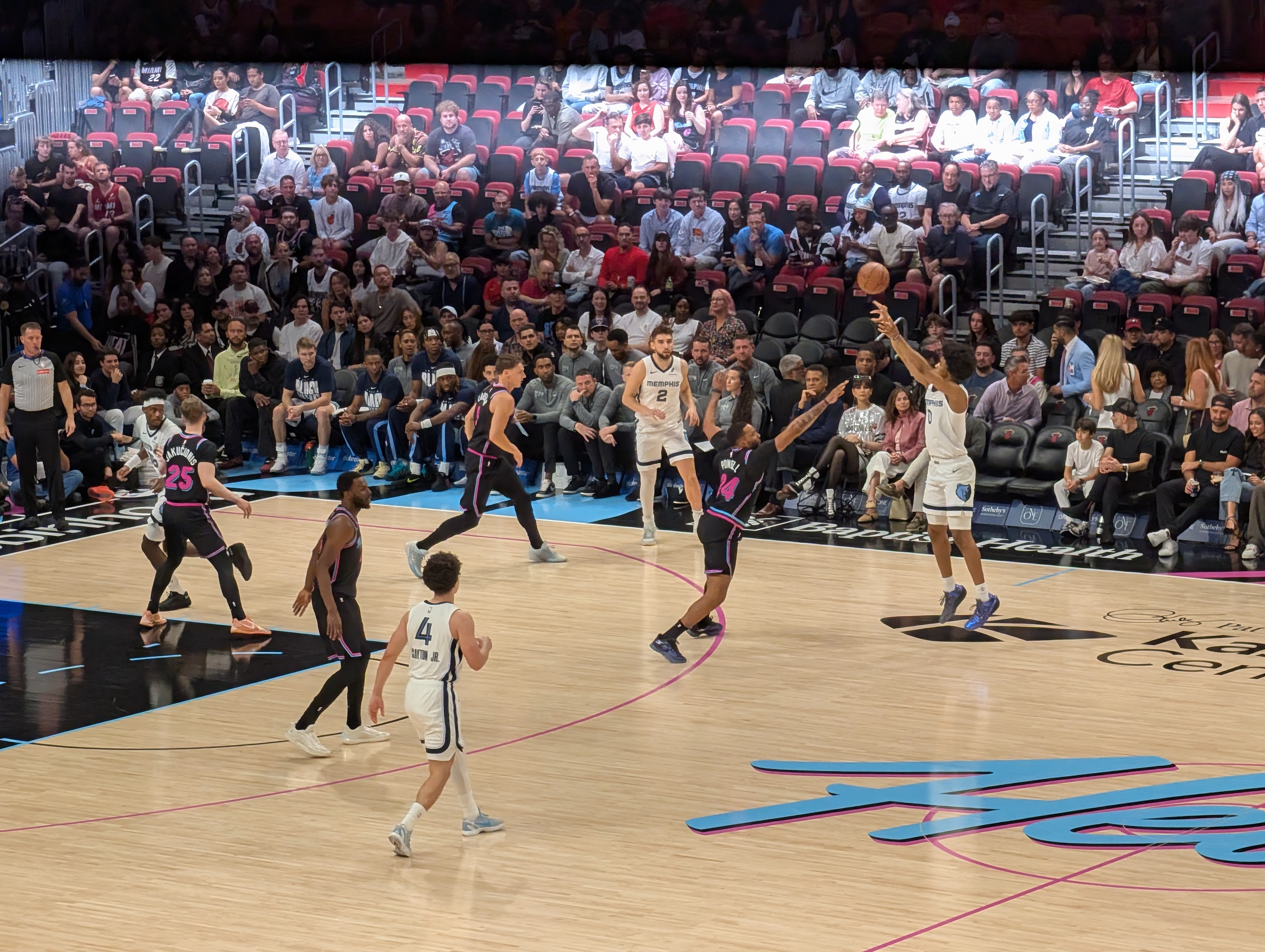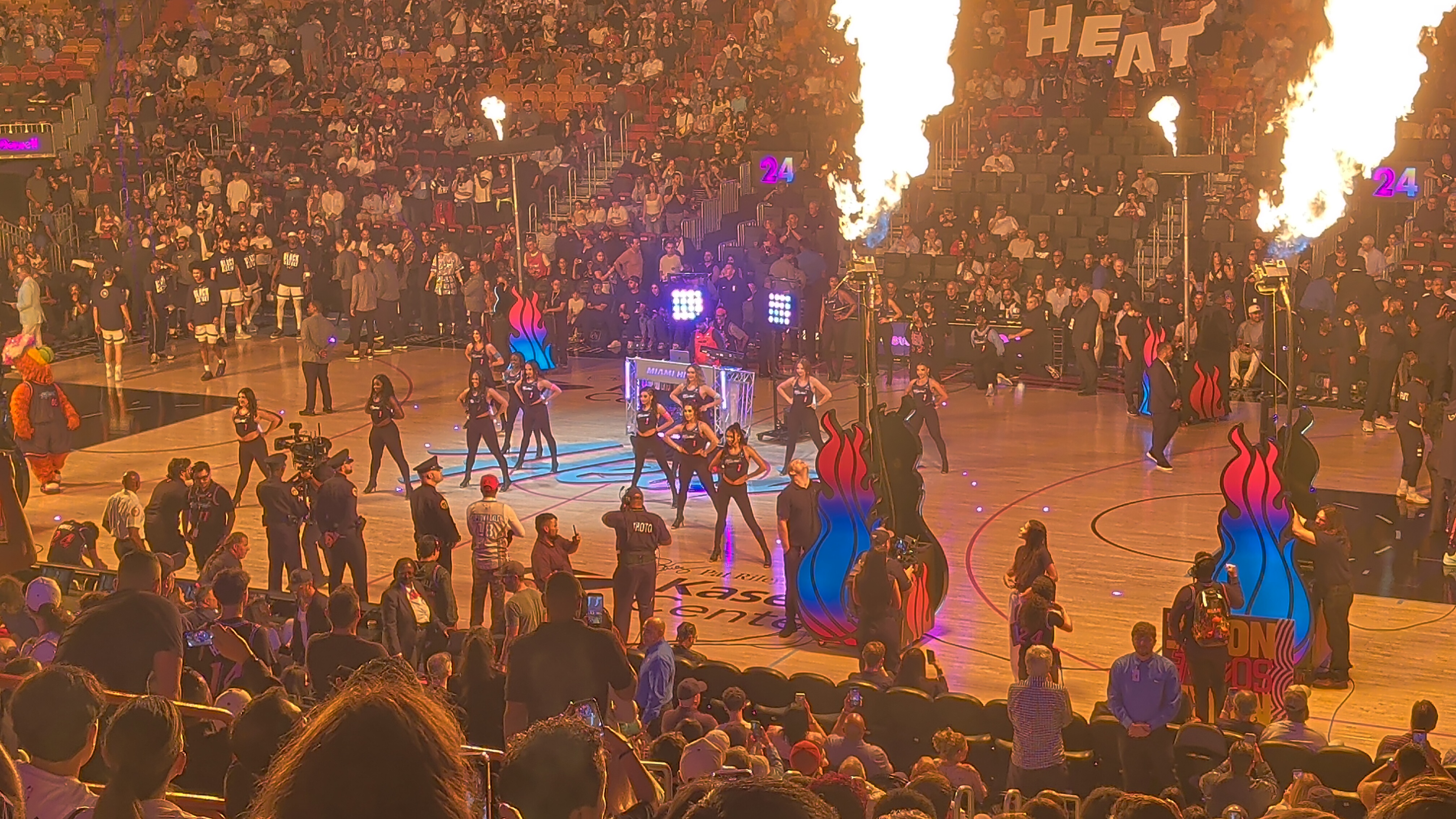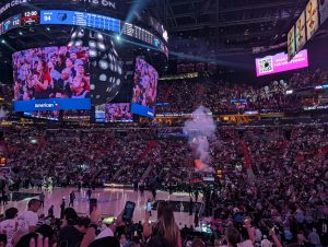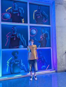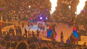 Pak jsme už šli do haly, abychom viděli i rozcvičku. Byla tam strašná zima (Američani to opravdu přehánějí s klimatizací), ale to jsme si říkali, že vydýchají a zahřejí diváci, až se zaplní hala. Ale jediný moment, kdy jsem se neklepala zimou byl nástup domácích, kdy zapli plamenomety otočené směrem k nám. Škoda, že na soupisce nemohlo být víc hráčů.. Jinak byl zápas úplně úžasný, hráči jsou fyzicky neskuteční. A i když hrají mnohem víc sobecky než v Evropě, některé akce mi vyrazily dech. Nakonec s přehledem vyhráli Heats a my se opravdu těšili ven do tepla :). (Opravdu to stálo za to. Modří vědí, co tím myslím 🙂 ).Pak jsme se ještě prošli mezi osvětlenými mrakodrapy na náš vlak a s usínajícími dětmi dorazili “domů” a okamžitě usnuli.