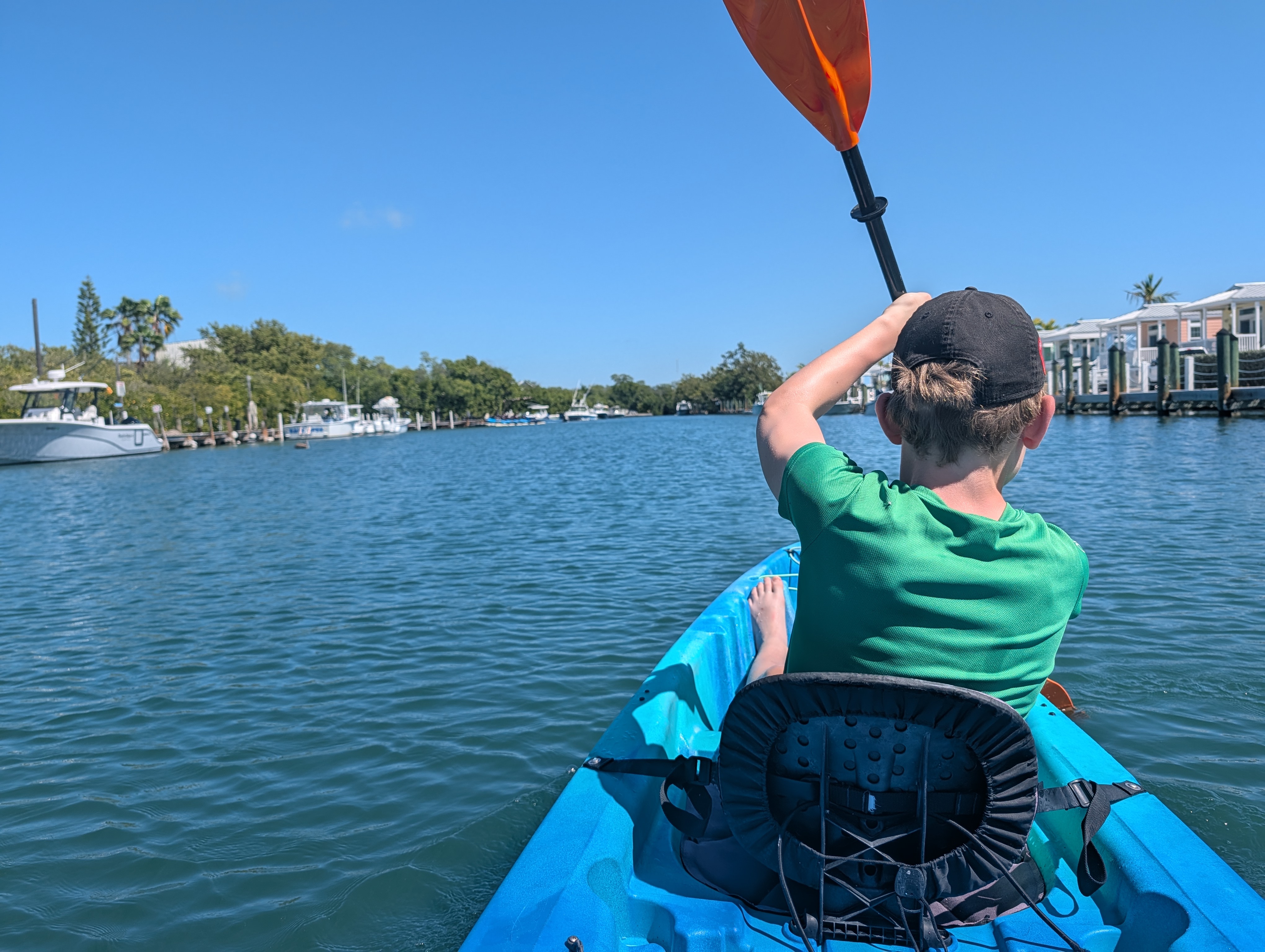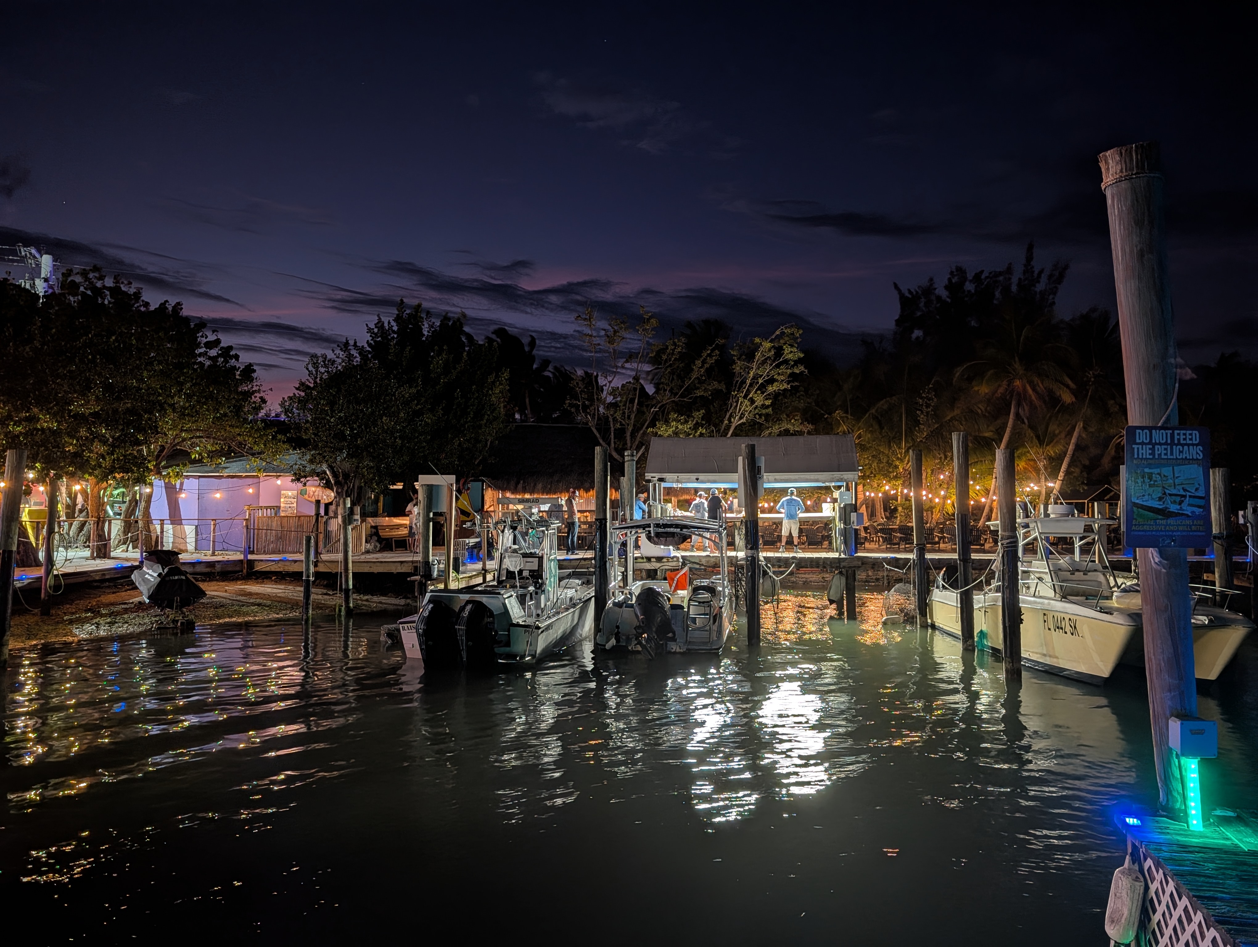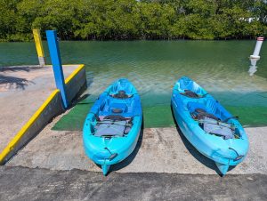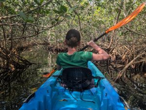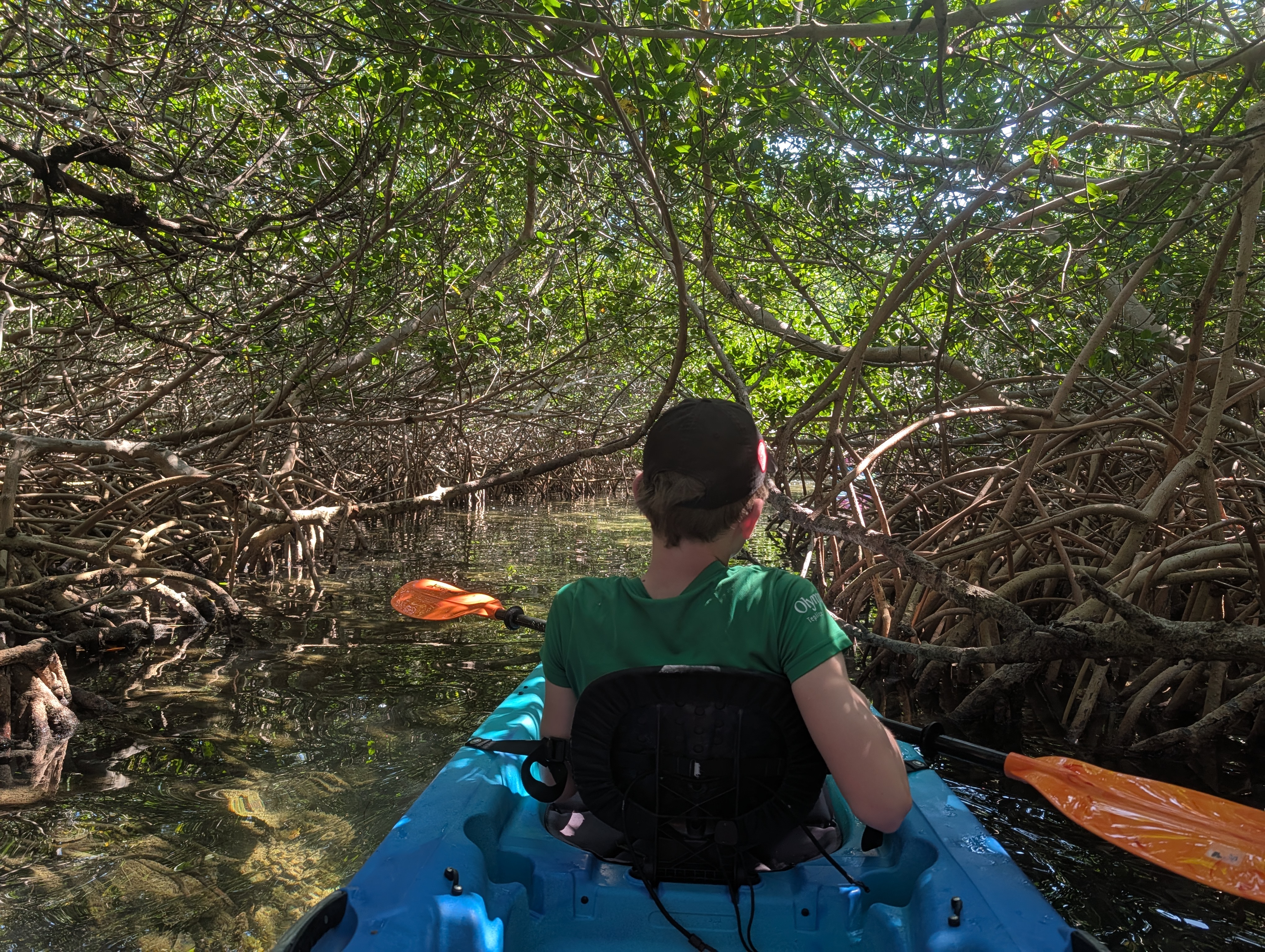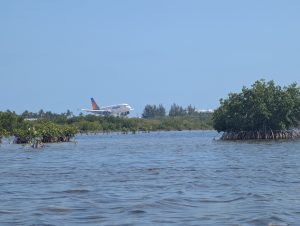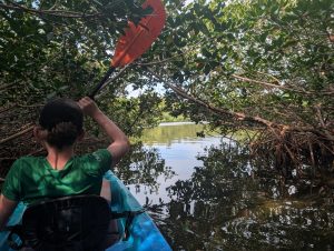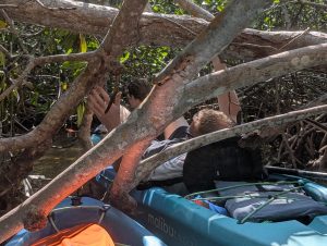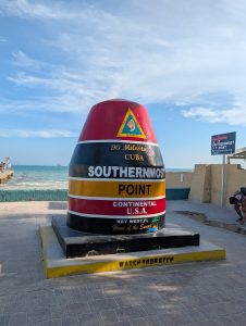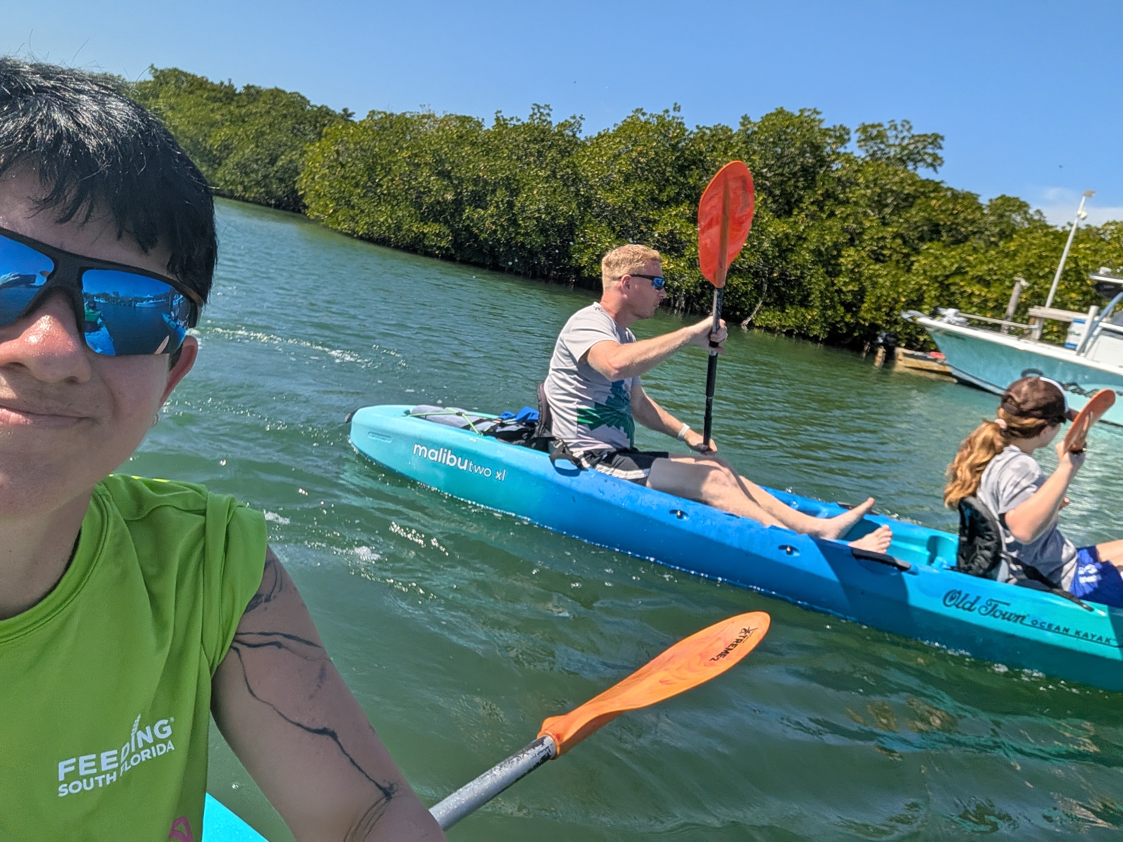 Nejdřív jsme jeli po moři, abychom si projeli zátoku, pak jsme (asi podle instrukcí) zamířili k mangrovům a proplouvali tunely mezi nimi. Bylo to SUPR! Občas se někdo zachytil na stromě a museli jsme ho stahovat, všichni dostali minimálně facky z visících větví, ale opravdu to bylo úžasné. Dokonce jsme dojeli k “jezírku” hned u letiště, kde jsme přímo z vody mohli pozorovat vzlétání a přistávání letadel. Horší bylo trefit cestu zpět, občas jsme zajeli mezi mangrovy a najednou to končilo, takže jsme s Míšou zdokonalili couvání, dokázali jsme vyvouvat i úzké tunely. Posádka PV prošla několika krizemi, nejvíc se osvědčil model, kdy Verča radši ani neveslovala (ano, měli jsme vesla, ne pádla 🙂 ) a mlčela. Teda až na situaci, kdy začala šíleně ječet, když přejížděli nějakým úzkým tunelem a zasekli se, že je na stromě něco mezi krabem a pavoukem. Když to chtěl P vidět, tak ho seřvala, že nejede pryč. My jsme naštěstí jeli první, protože nevím, jak bych tam pak projížděla já :). Je to neuvěřitelné, ale opravdu jsme vrátili celé lodě, dokonce na správném místě. Povzbuzeni nečekaným úspěchem jsme se rozhodli dojet ještě na nejjižnější bod pevninského USA a pak najít otevřenou kavárnu a až pak vyrazili na dlouhou cestu zpět. I z místa spolujezdce je to nádherná cesta. Zastavili jsme se ještě v Robbie’s Islamorada, kde jsme krmili tarpony (obří stříbrné ryby, které žerou z ruky 🙂 ) a pak už jen nakoupit na zítra a zkusit vyprat. Teď řídí Péťa, takže doháním zápisky a už jsou online :).