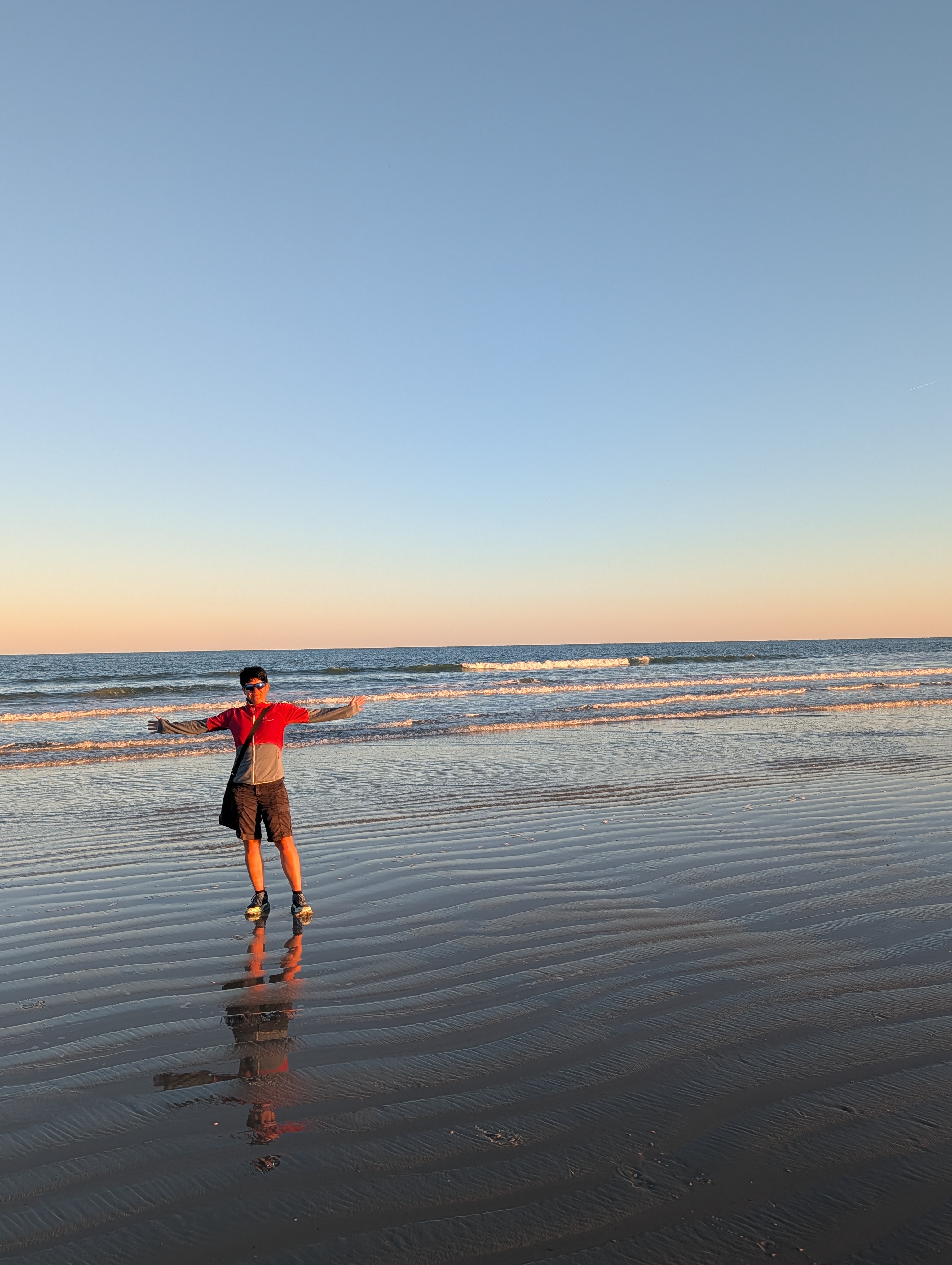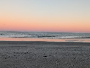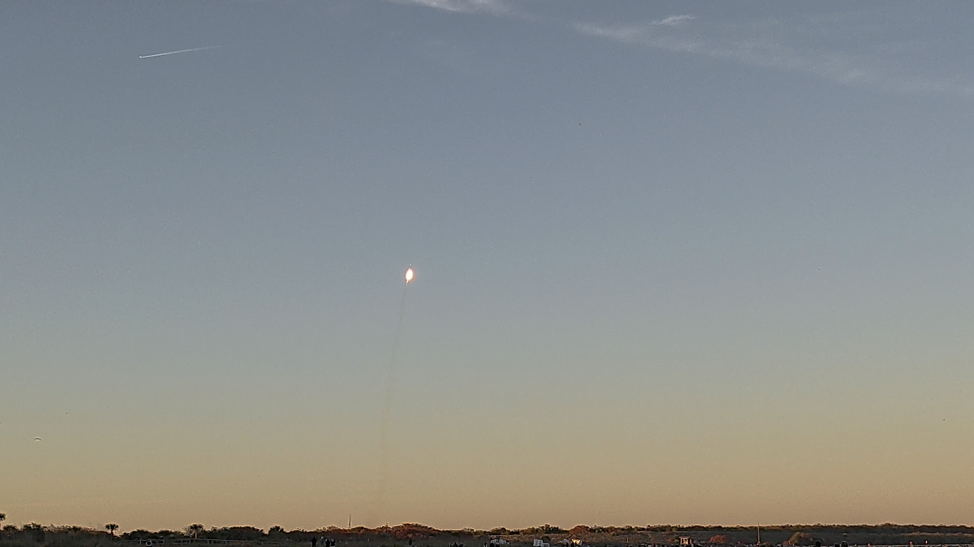 Nudná cesta se změnila v dobrodružství, když jsem musela jako místní několikrát objíždět zprava a nakonec jsme se dostali do půlhodinové kolony, takže jsme k hotelu dorazili až kolem půl čtvrté. Zaparkovali jsme auto a po zkontrolování aplikace jsem zjistila, že start byl přesunutý o dvě hodiny později, na 18:04. Takže jsme se alespoň ubytovali a vyrazili na pláž. A to byla chyba. Bylo asi 13 stupňů a strašně foukalo a my jsme čekali dvě hodiny na start Falconu. Posouvali jsme se postupně nahoru po pláži, abychom měli co nejlepší výhled. Já chtěla koupit nějaké víno nebo prosecco na oslavu startu, tak jsem se na chvilku oddělila a odběhla do obchodu u benzinky. Teda tak by to probíhalo, kdyby to šlo hladce. S mapou v ruce jsem šla kolem hotelů přímo na západ, takže jsem viděla jen obrysy aut ap. V jednu chvíli se ke mě pomalu blížilo nějaké auto, tak jsem mu chtěla uhnout a šlápla jsem na trávník a chtěla jsem počkat, až projede. Ale on neprojel, zastavil u mě, otevřely se dveře a vystoupil policajt. Co tady dělám. Tak jsem šla k němu, že hledám potraviny. A on hned Ustupte a jděte před auto! Já s sebou neměla ani pasy, takže stačilo, aby chtěl, abych se identifikovala a byl by problém. Naštěstí jsme se nakonec nějak domluvili, že chci jen nakoupit něco k jídlu (o víně jsem radši pomlčela), on mi našel na svém telefonu nejbližší obchod a nakonec mě k němu hodil. Hezky jsem mu poděkovala, koupila víno v papírovém pytlíku (tady se nesmí pít na veřejnosti, dokonce i kdyz jsem šla z haly z NBA s kelímkem v ruce, tak kontrolovali, že tam už nemám pití) a obešla ho tak, abych ho cestou už nepotkala.