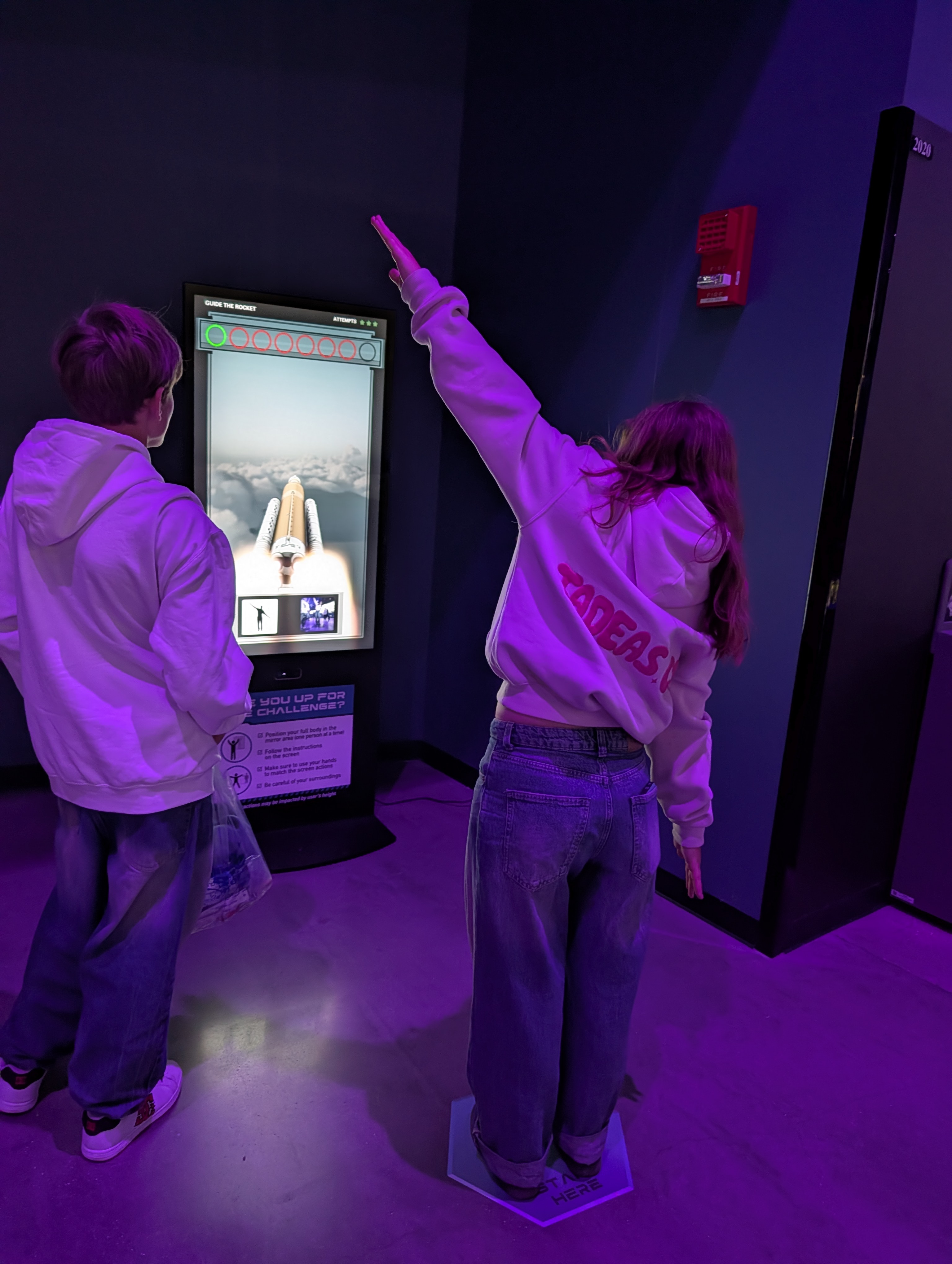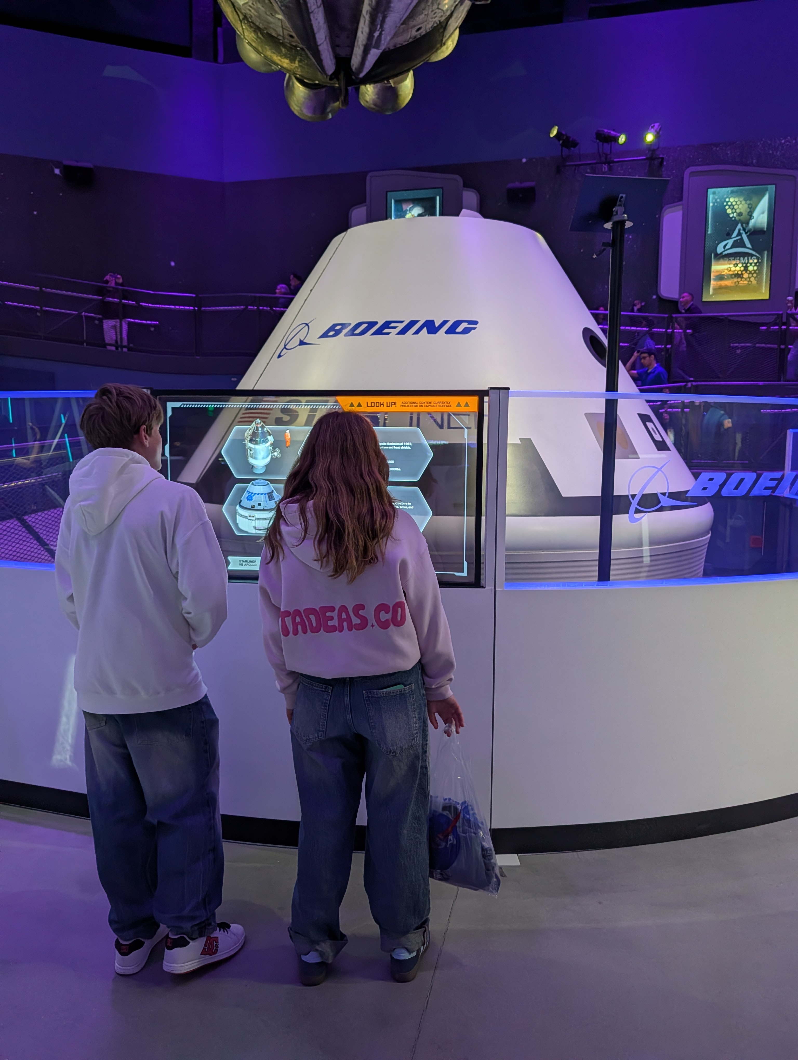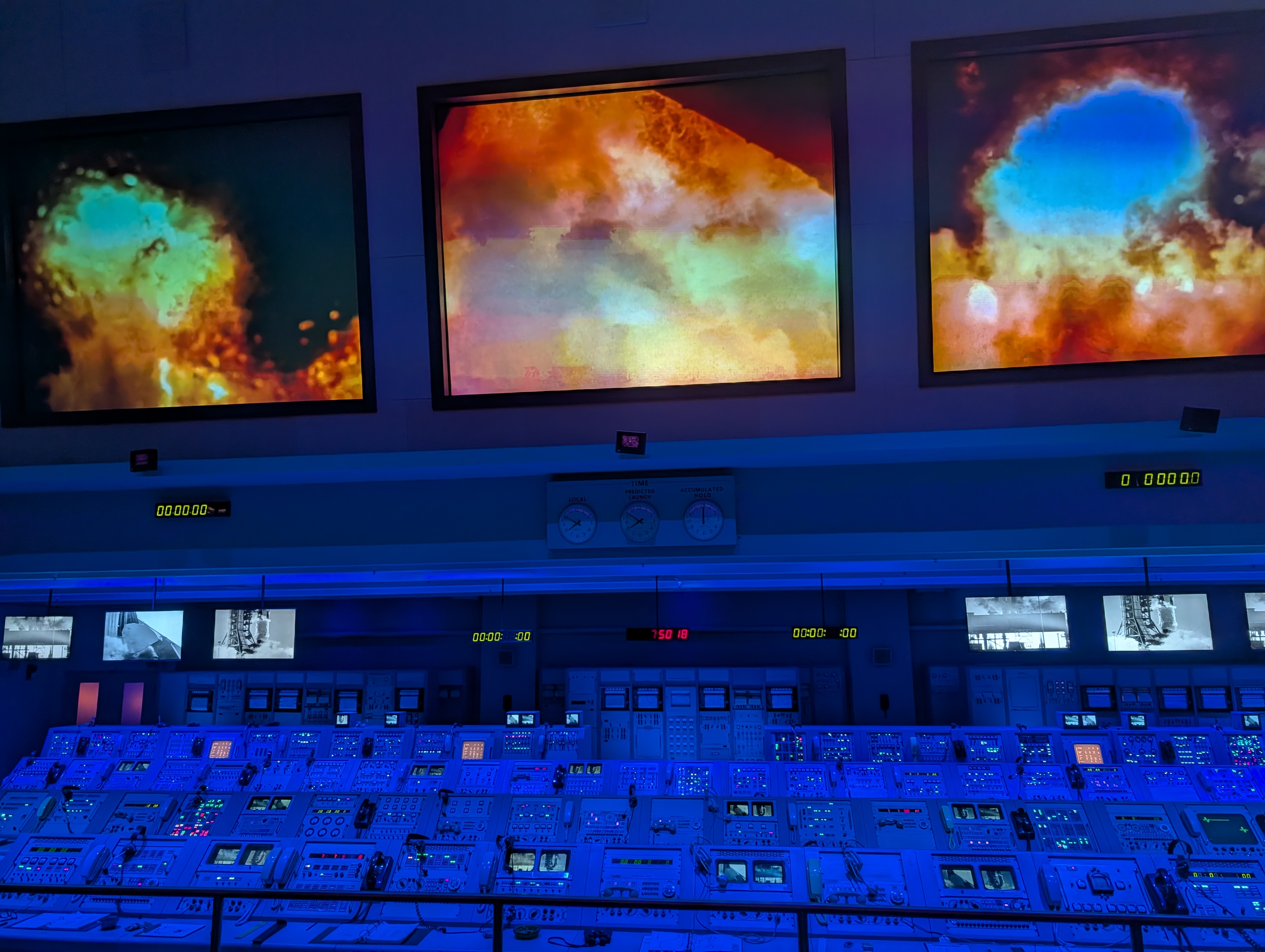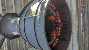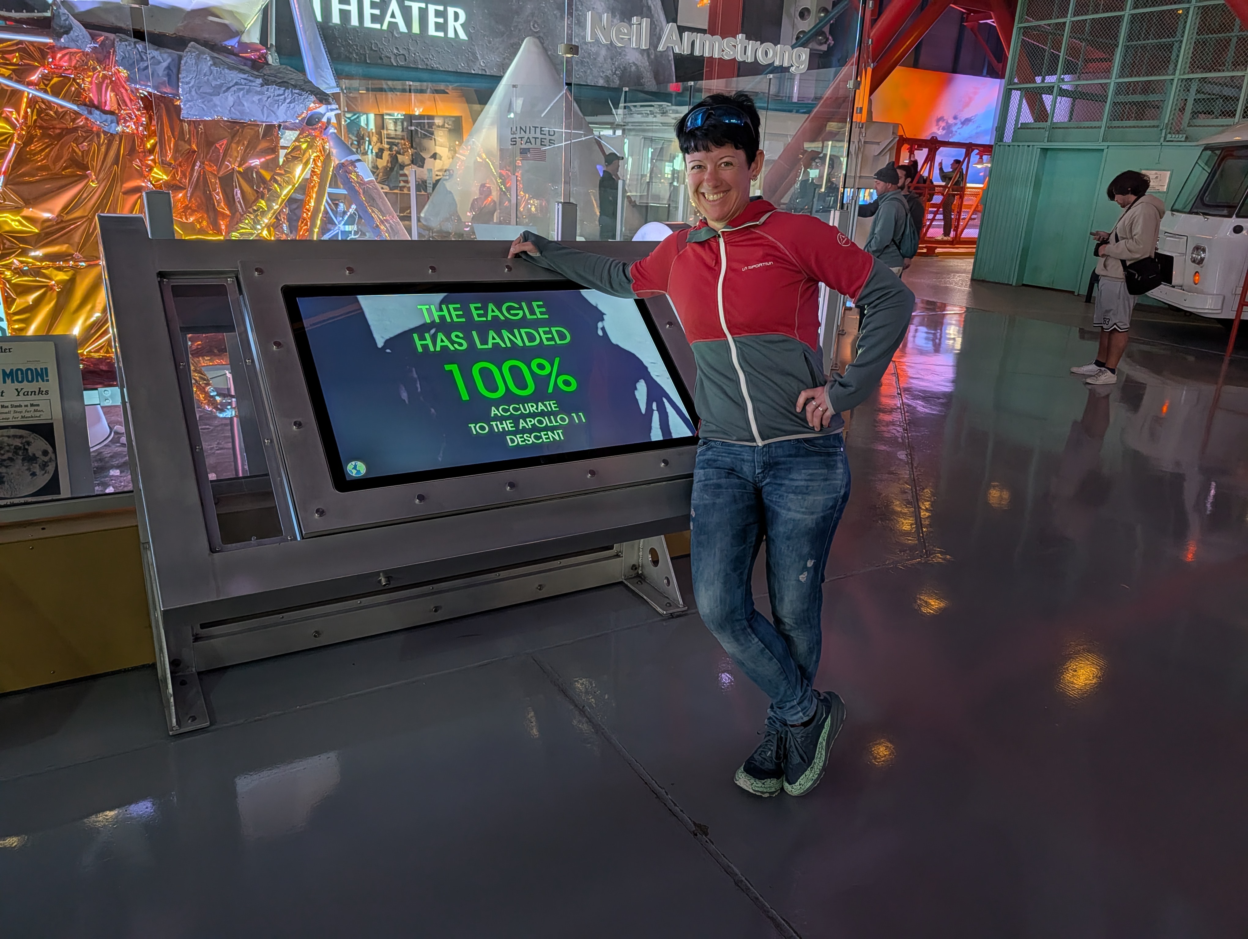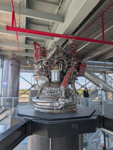 U vchodu do NASA Space Center jsme byli pár minut před devátou, ale už jsme stáli ve frontě na vstup. V 9 zazněla americká hymna, všichni se drželi za srdce a koukali na plátno, až pak teprve otevřeli vstupní turnikety. My stáli samozřejmě v nejpomalejším pruhu. Pak jsme teda taky trošku zdržovali, protože jsem si myslela, že máme jeden lístek pro všechny, ale nebylo to tak a v aplikaci nešlo překliknout na další vstupenky. Ale i s tím jsme se nakonec poprali a dostali se dovnitř. Měla jsem načtené, že nejdřív máme jít na bus tour, která nás vezme na dvě zastávky – Gantry at LC-39 a Apollo/Saturn V Center. LC-39 je startovní komplex NASA, gantry je servisní konstrukce, která umožňuje přístup k raketě před startem. Je to nově otevřená část pro veřejnost, takže jsme jako jedni z prvních viděli místo, kde startovaly všechno Apollo mise (včetně Apolla 11), Saturn V a třeba včera tam startoval SpaceX Falcon 9. Dostali jsme se na vyhlídkovou věž s výhledem na rampy a byla tam interaktivní expozice o startovní infrastruktuře.